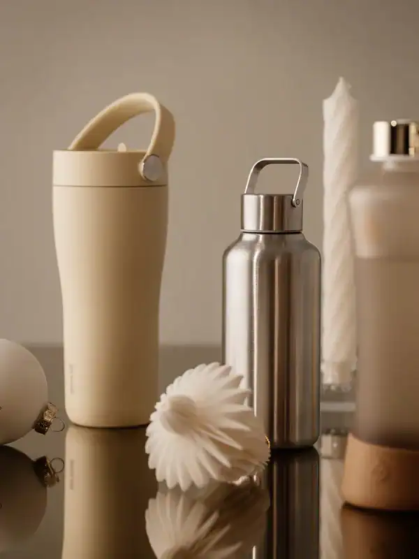Puodelis pagamintas iš nerūdijančio plieno, dangtelis ir šiaudelis iš polipropileno, rankenėlė iš TPE plastiko, rankenėlės sujungimo sagelės iš plieno.